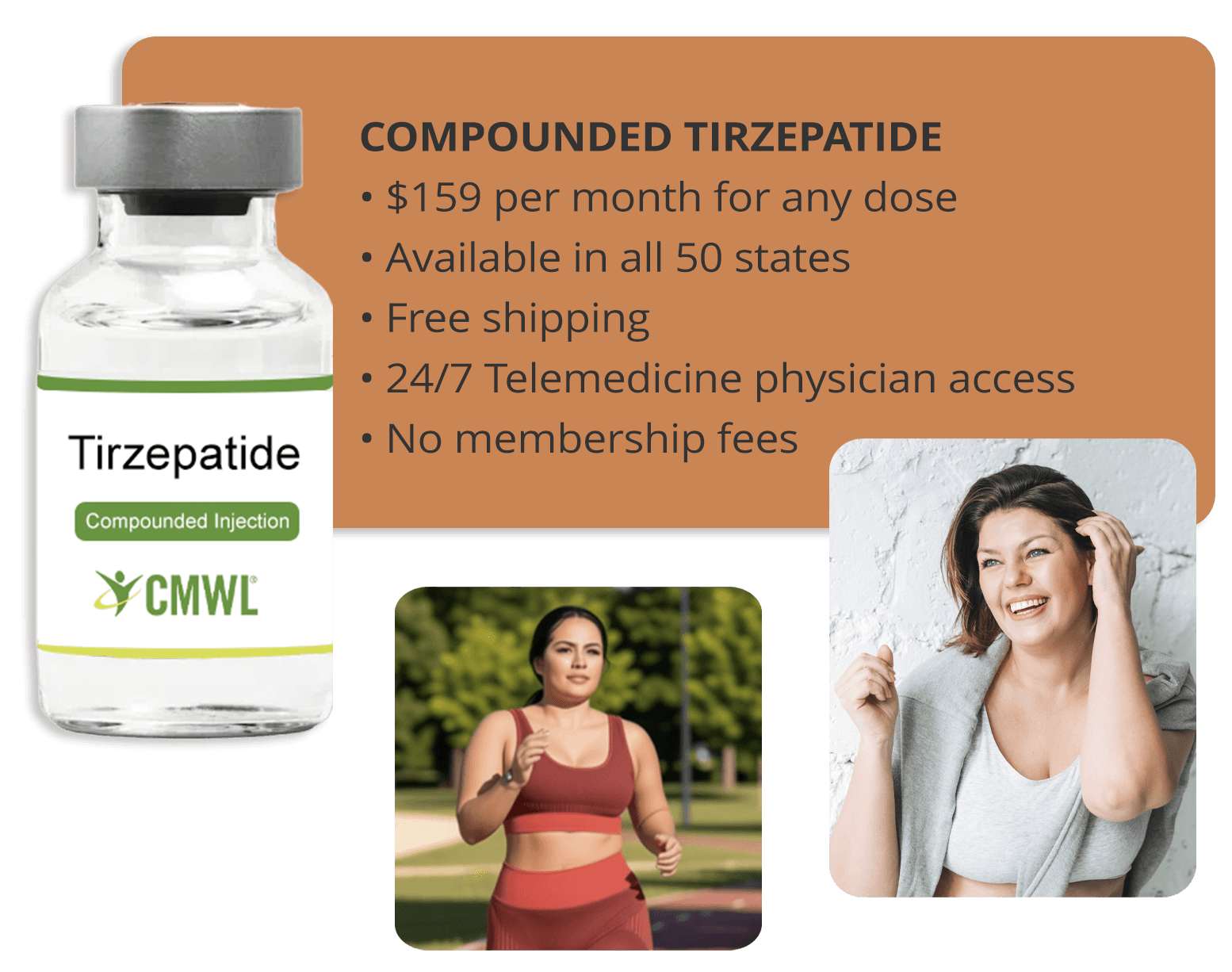 Each monthly plan includes direct-ship GLP-1 prescriptions, medical provider review, 24/7 chat access to a provider, and refill consultations. As part of your CMWL plan, you’ll also receive free access to our online behavioral and lifestyle Reset Plan that teaches you the fundamentals of successful weight management. See the pricing for semaglutide and tirzepatide plans. We also offer plan financing for 6-month and 12-month plans (see Klarna payment option at checkout). No insurance is necessary, but you may be eligible to use your HSA or FSA account. We also provide the option of selecting brand-name FDA-approved medication